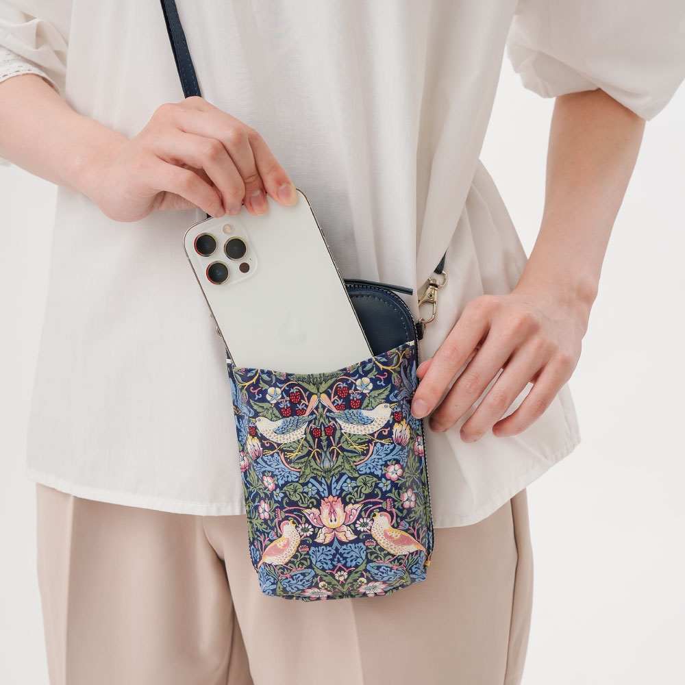 スマホをサッと取り出せるショルダータイプのスマホポシェットでお出かけ時も両手が使えて便利です。「いちご泥棒」は、19世紀にデザインされた、インディゴ抜染により赤や黄色といった藍色以外の色を取り入れたテキスタイル。外ポケットは大きなスマホもすっぽり入り、必要な時にサッと取り出せます。(スマホ適応サイズ:(約)幅9.0×高さ17.0×厚み1.4(㎝)まで)ファスナーを開くと蛇腹式ポケットが広がり、中身も見やすく、取り出しもしやすい!スマホはもちろん、財布、カード、カギ、メモ帳、リップなどお出掛けに必要な物が入ります。外出時に欠かせないICカードを、カードポケットに入れれば、改札の際もサッとかざすだけ。ショルダーストラップは最短70㎝~最長140㎝まで自由に調節可能で、お好みの長さに調節できます。目を惹く華やかなデザインで、誕生日や母の日などの大切な人へのプレゼントにピッタリです。