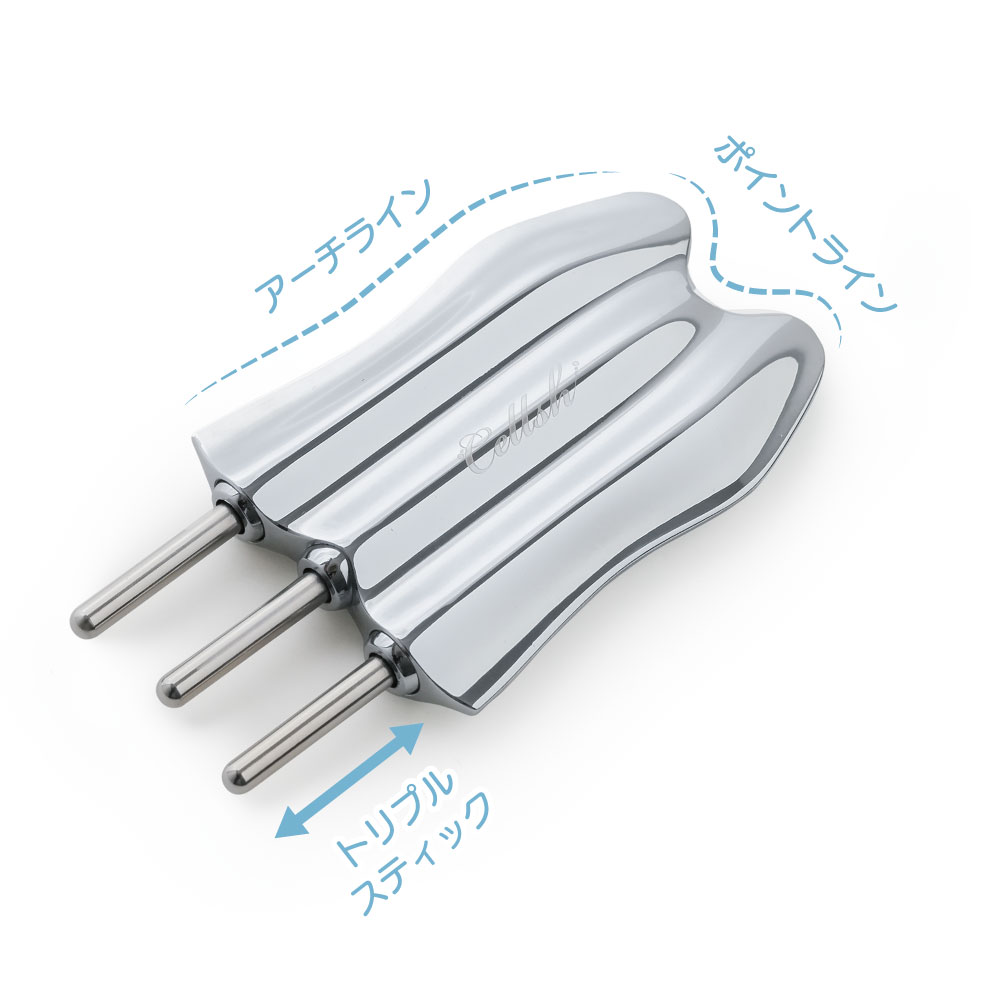 トリプルティックで広範囲&細かな筋肉のコリをほぐしてスッキリ!トリプルスティックは肌に押し当てると内部のバネの動きによりスティックが上下に伸縮し、程よい強さで筋肉のコリをほぐします。点の刺激で顔まわりの細やかな筋肉を押しほぐして気持ちいい!※指圧代用器の効果は、トリプルスティック部を肌に押し当てている時に限ります。