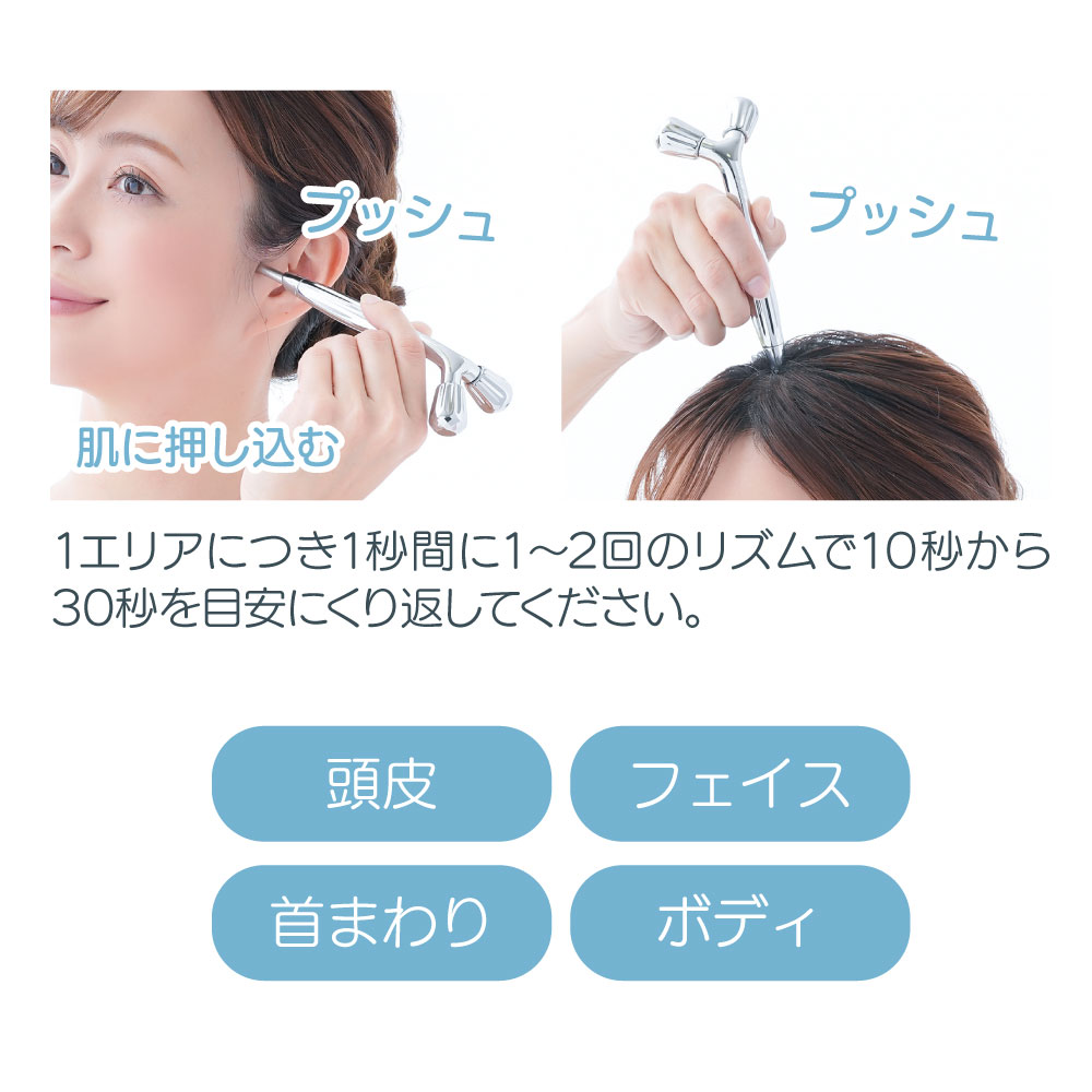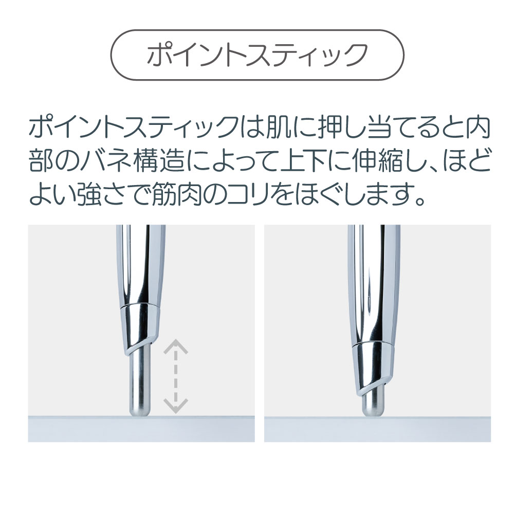 ポイントスティックは肌に押し当てると内部のバネの動きによりスティックが上下に伸縮し、程よい強さで筋肉のコリをほぐします。点の刺激で気になるところの筋肉を押しほぐして気持ちいい!※指圧代用器の効果は、本品を肌に押し当てている時に限ります。頭皮・顔だけでなく首まわりやボディなど気になるところを心地よく刺激します。リラックスタイムやお風呂上がりなど、自分の好きなタイミングでサッとケアできます♪※入浴中はご使用しないでください。